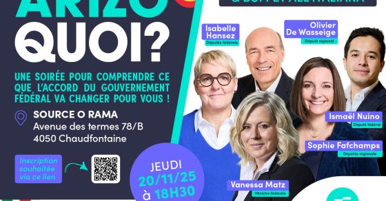 Nous vous invitons à une soirée d’échanges avec : Vanessa Matz, Ministre fédérale – Isabelle Hansez, Députée fédérale – Olivier De Wasseige, Député régional – Ismaël Nuino, Député fédéral – Sophie Fafchamps, Députée régionale.