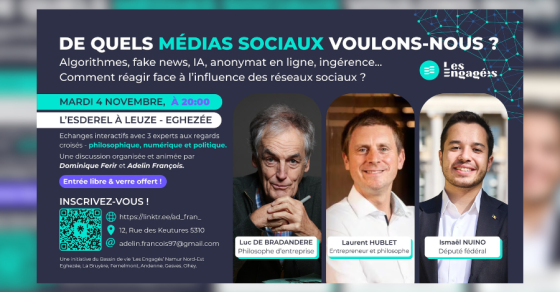 Trois invités aux parcours et visions complémentaires – Luc de Brabandère, Laurent Hublet et Ismaël Nuino – croiseront leurs regards philosophique, numérique et politique pour éclairer ce sujet face auquel nous nous sentons parfois démunis.