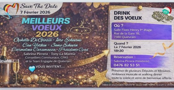 À l’occasion de la nouvelle année, Ophélie Di Giosia, 1ʳᵉ Échevine, Can Yetkin, 3ᵉ Échevin, Carmelina Caramazza, Présidente du CPAS, accompagnés des conseillers communaux, du CPAS et de la Team Engagée de Quievrain, ont le plaisir de vous inviter à leur Drink des vœux 2026.