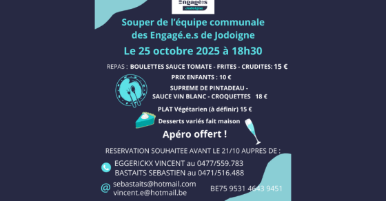 Le 25 octobre prochain, notre nouvelle équipe communale de Jodoigne organise son 1er souper annuel et nous serions ravis de te compter parmi nos convives ! Partant pour passer une belle soirée à nos côtés ?