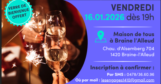 Les sections communales de Braine-l’Alleud, Waterloo et Rhode-Saint-Genese ont le plaisir de vous convier à leur drink du Nouvel-An. Ils ont décidé de s’unir pour organiser cette soirée conviviale durant laquelle vous pourrez rencontrer vos élu.e.s locaux ainsi que plusieurs figures bien connues du Mouvement.